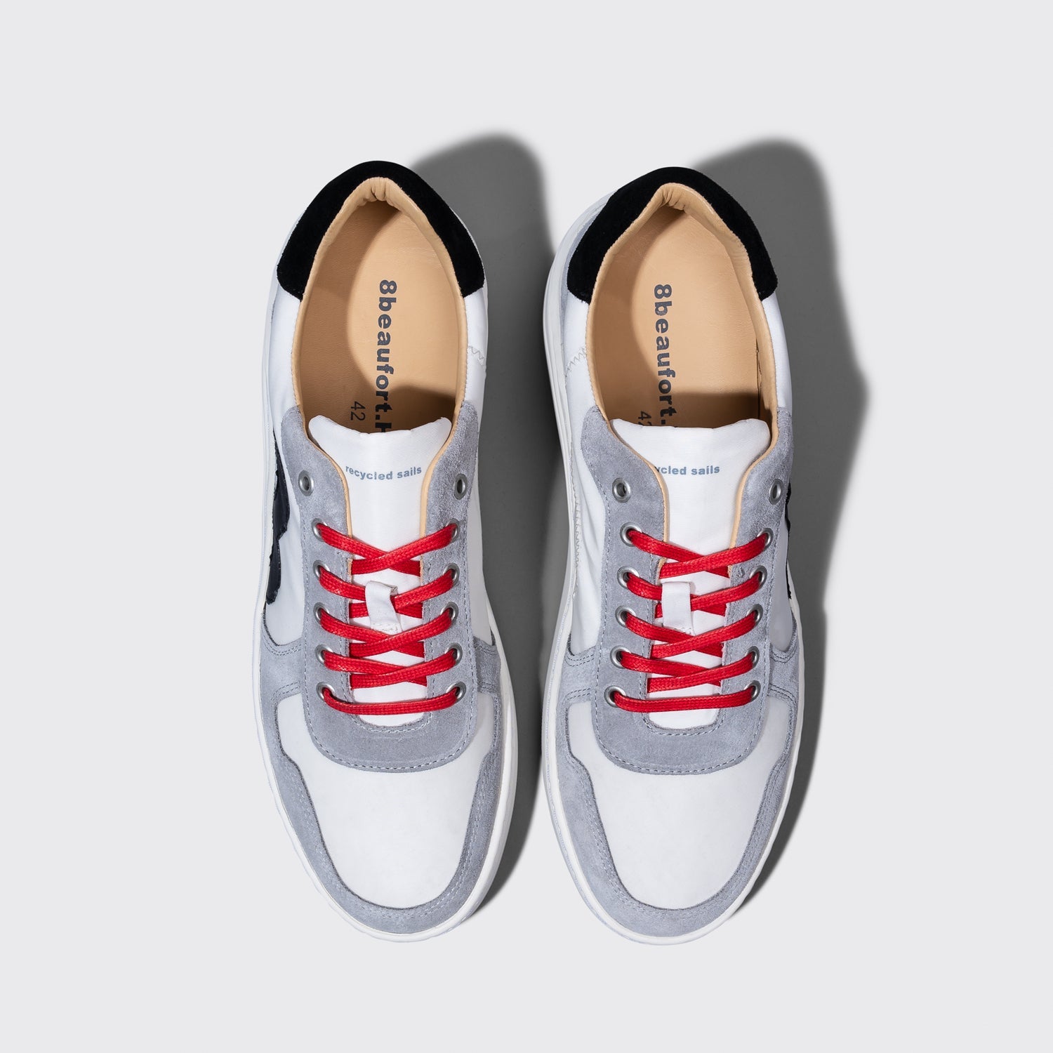 White sneakers for men from 8beaufort.Hamburg, made from recycled canvas, with suede details, upcycling of life jackets and a sole made of super soft natural rubber. Inner lining made of genuine, chrome-free, vegetable tanned leather.