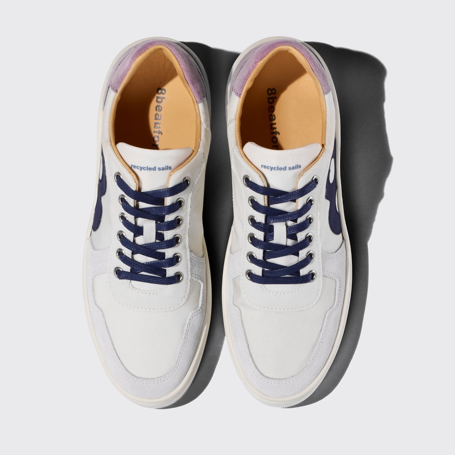 White sneaker for men by 8beaufort.Hamburg, made of recycled canvas, with details made of suede, upcycling of life jackets and a sole made of super soft natural rubber. Lining made of real chrome-free vegetable tanned leather.