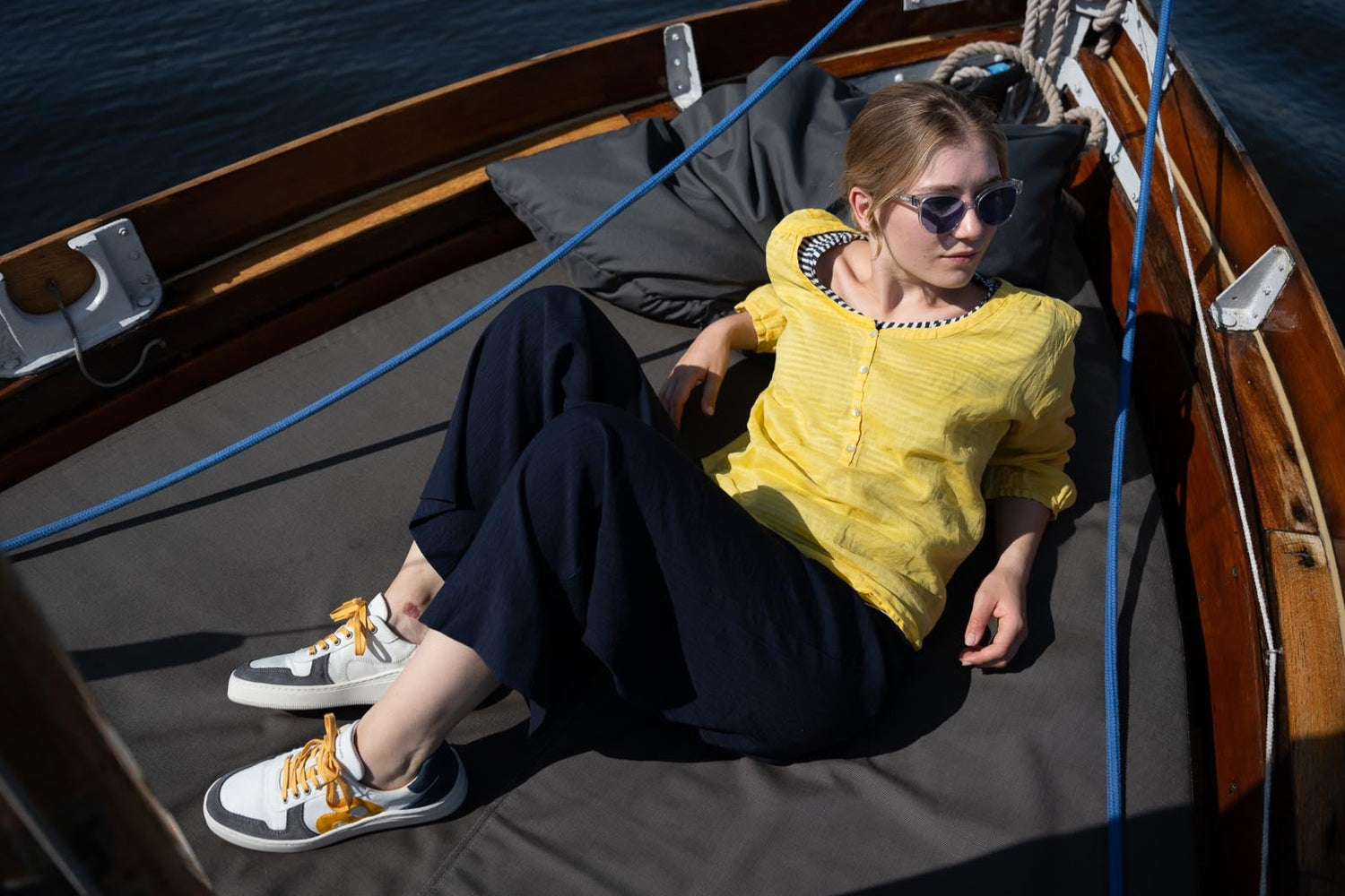 - Sohle: Naturkautschuk - Upper: Upgecyceltes Segeltuch, Veloursleder, Upcycling Rettungsweste - Innensohle: Naturlatex mit chromfrei gegerbtem Leder.