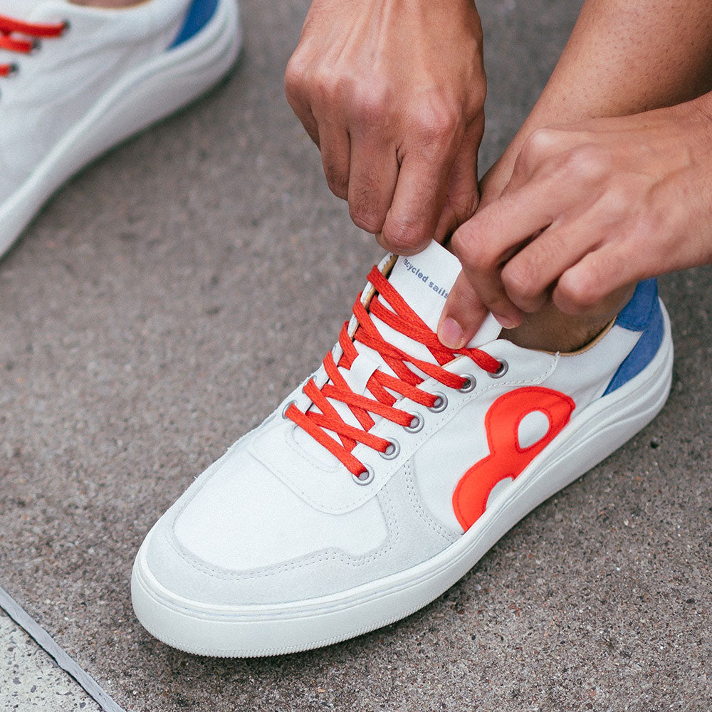 Weißer Sneaker für Herren von 8beaufort.Hamburg, gefertigt aus recyceltem Segeltuch, mit Details aus Veloursleder, Upcycling von Rettungswesten und einer Sohle aus superweichem Naturkautschuk. Innenfutter aus echtem chromfrei vegetabil gegerbtem Leder.