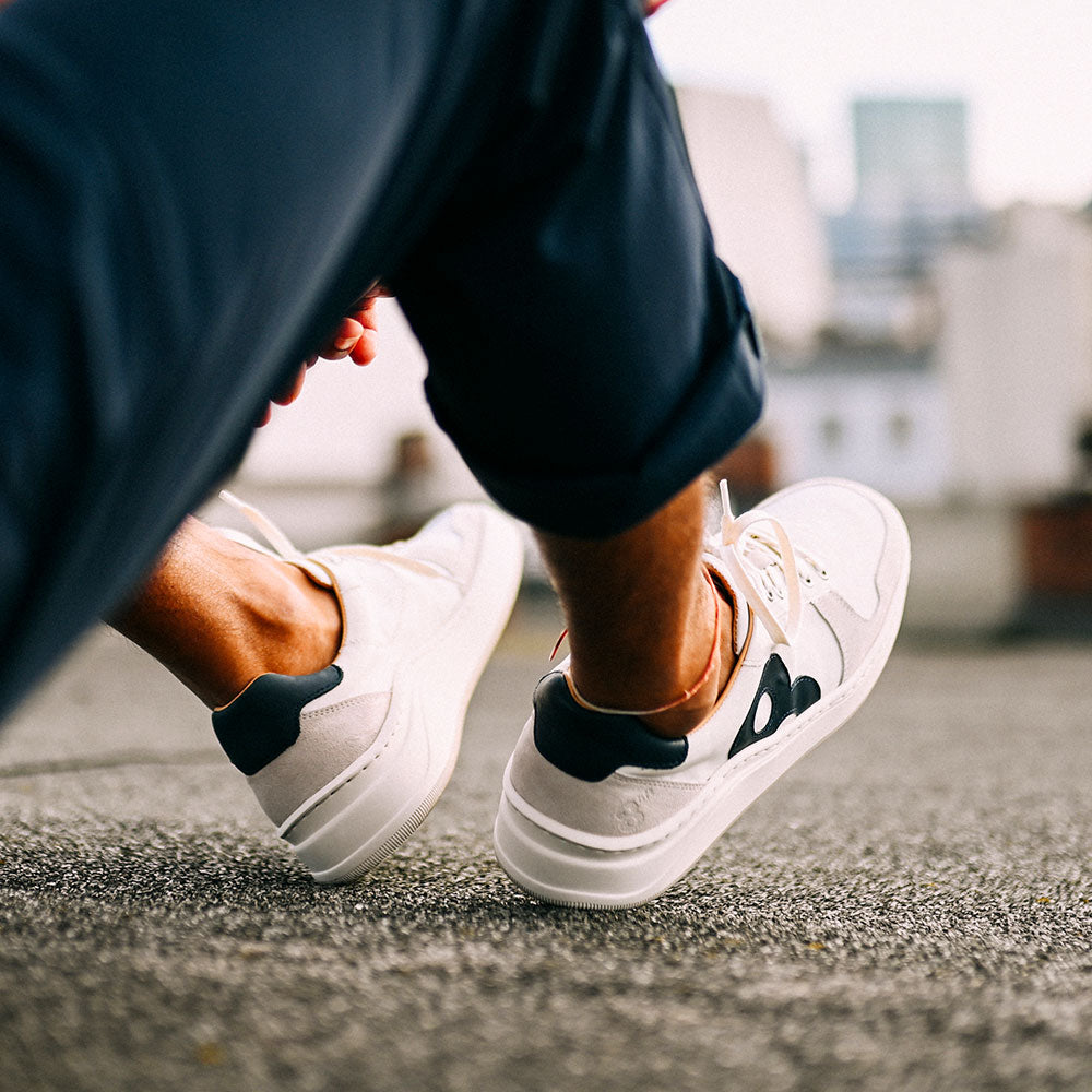Weißer Sneaker für Herren von 8beaufort.Hamburg, gefertigt aus recyceltem Segeltuch, mit Details aus Veloursleder, Upcycling von Rettungswesten und einer Sohle aus superweichem Naturkautschuk. Innenfutter aus echtem chromfrei vegetabil gegerbtem Leder.