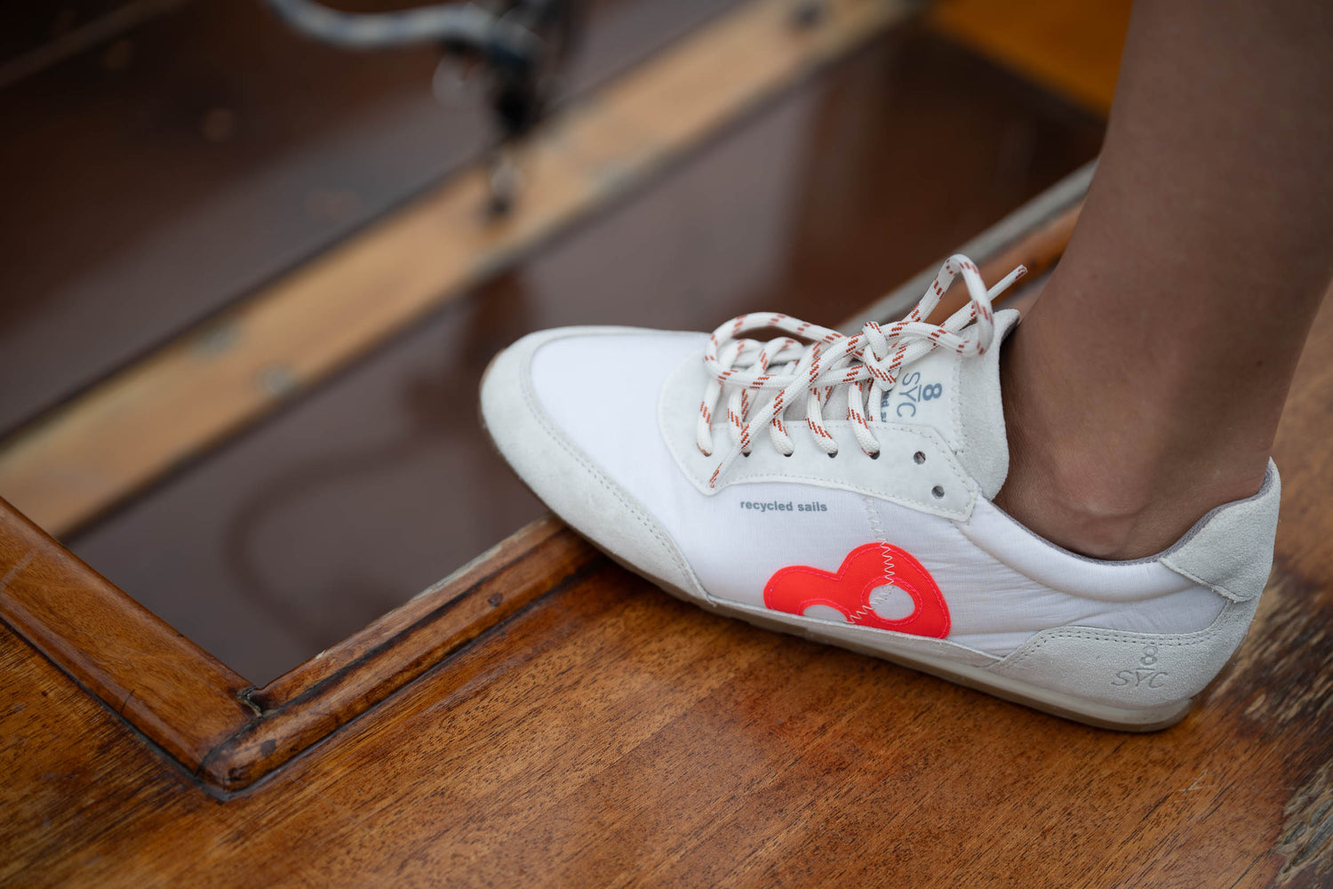 recyceltes SpinnakKer Segeltuch, recycelte Rettungswesten, flexible Gummisohle Sohle: Naturkautschuk Innenfutter: Chromfrei gegerbtes Leder Innensohle: Komfortables Fußbett aus Latex, herausnehmbar Elastische Schnürsenkel made in Portugal