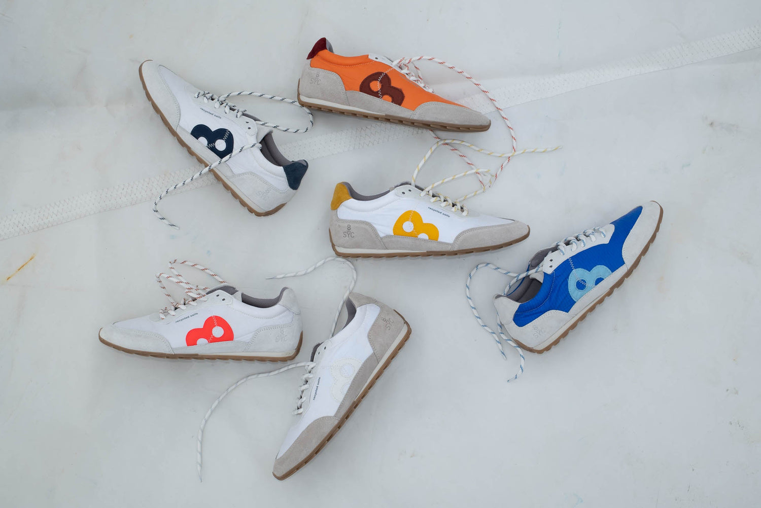 recyceltes SpinnakKer Segeltuch, recycelte Rettungswesten, flexible Gummisohle Sohle: Naturkautschuk Innenfutter: Chromfrei gegerbtes Leder Innensohle: Komfortables Fußbett aus Latex, herausnehmbar Elastische Schnürsenkel made in Portugal