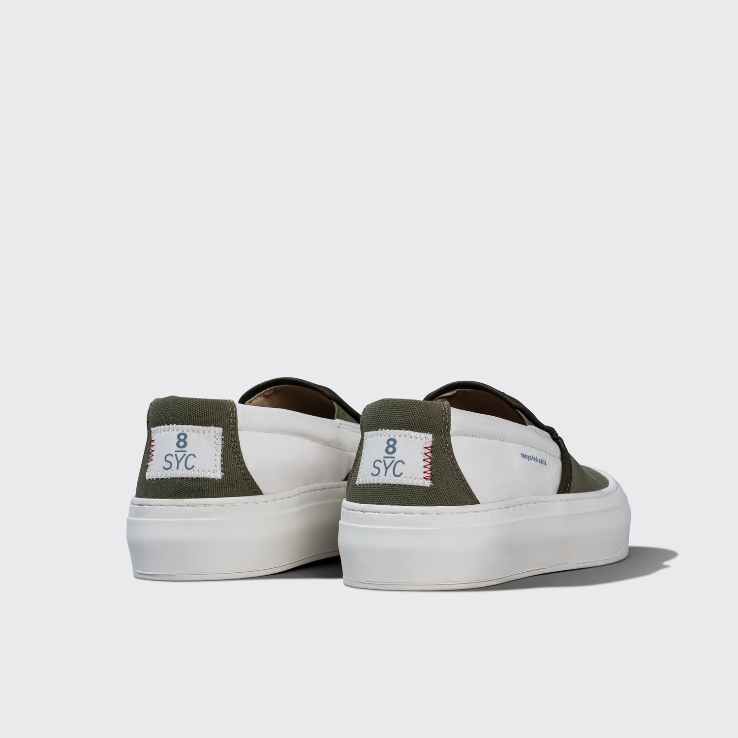 Recyceltes Segeltuch und Baumwolle bilden die Basis für diesen entspannten Slip On Look. Er kommt in zwei sommerlichen Farbkombination daher: olive und sand.
