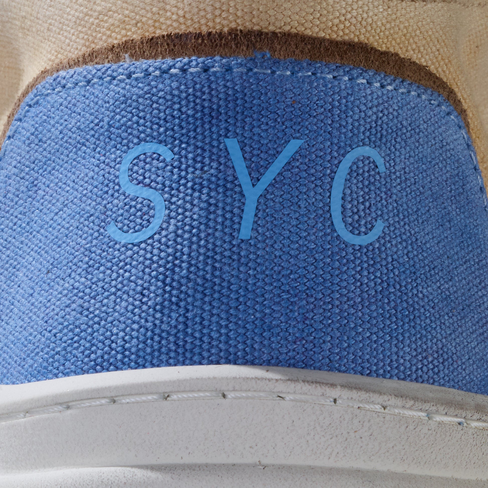 Gefertigt aus recyceltem Segeltuch, mit Details aus recyceltem Canvas, Upcycling von Rettungswesten und einer Sohle aus superweichem Naturkautschuk.
