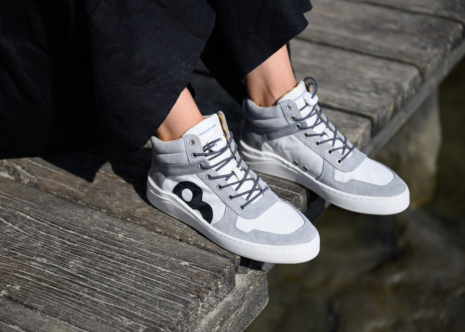 Weißer Mid High Sneaker für Damen von 8beaufort.Hamburg, gefertigt aus recyceltem Segeltuch, mit Innenfutter aus vegetabil und chromfrei gegerbtem Leder und Baumwolle. Sohle aus Naturkautschuk und flexible Schnürsenkel. Das Leder, welches wir als Innenfutter verwenden kommt aus zertifizierten Gerbereien aus Portugal.