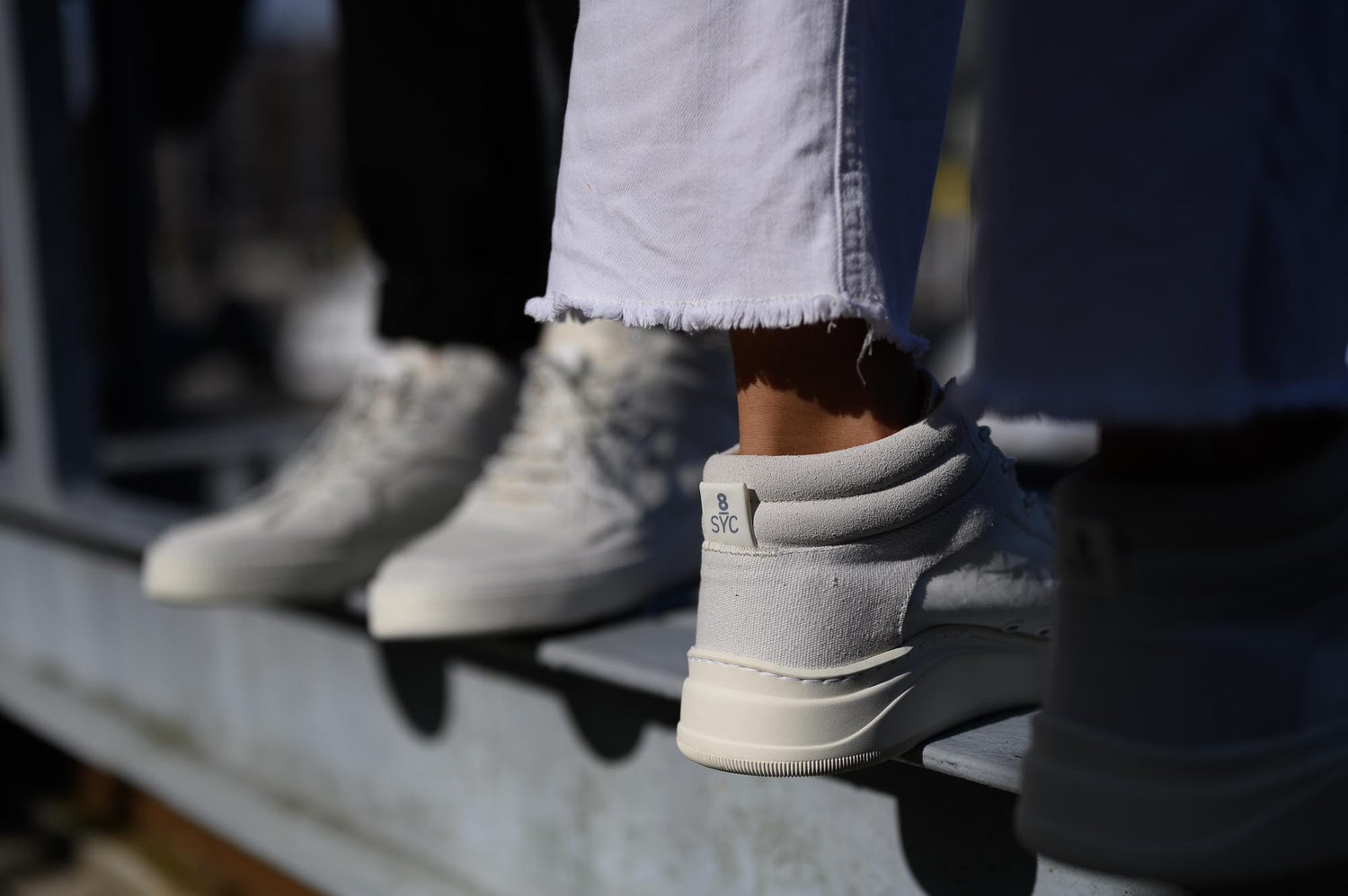 Weißer Mid High Sneaker für Damen von 8beaufort.Hamburg, gefertigt aus recyceltem Segeltuch, mit Innenfutter aus vegetabil und chromfrei gegerbtem Leder und Baumwolle. Sohle aus Naturkautschuk und flexible Schnürsenkel. Das Leder, welches wir als Innenfutter verwenden kommt aus zertifizierten Gerbereien aus Portugal.