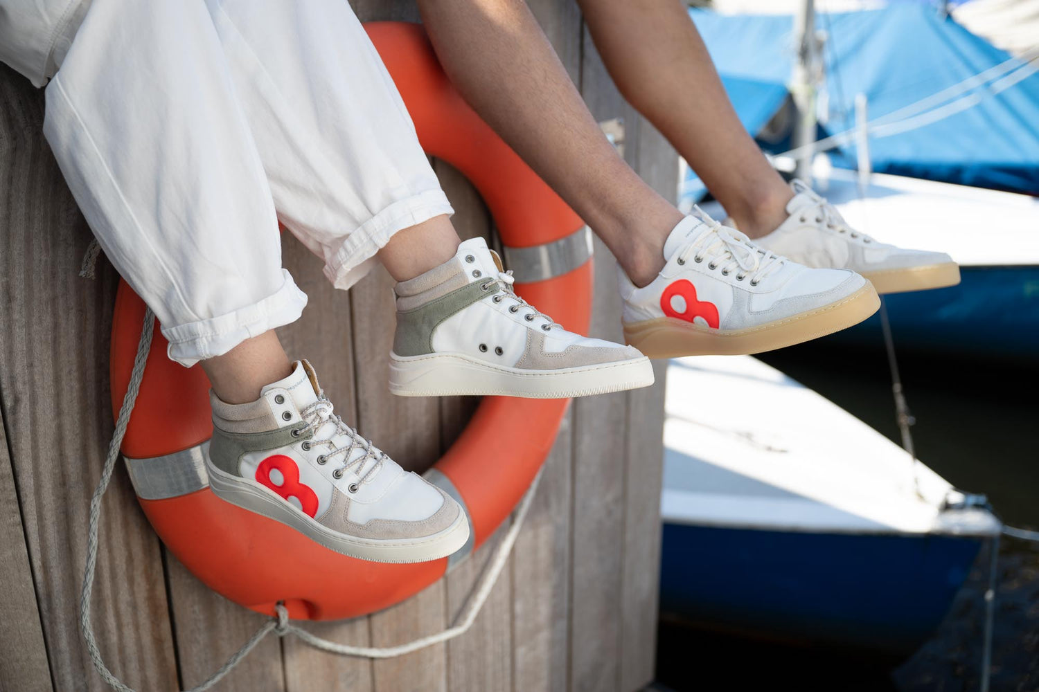 Weißer Mid High Sneaker für Damen von 8beaufort.Hamburg, gefertigt aus recyceltem Segeltuch, mit Innenfutter aus vegetabil und chromfrei gegerbtem Leder und Baumwolle. Sohle aus Naturkautschuk und flexible Schnürsenkel. Das Leder, welches wir als Innenfutter verwenden kommt aus zertifizierten Gerbereien aus Portugal.