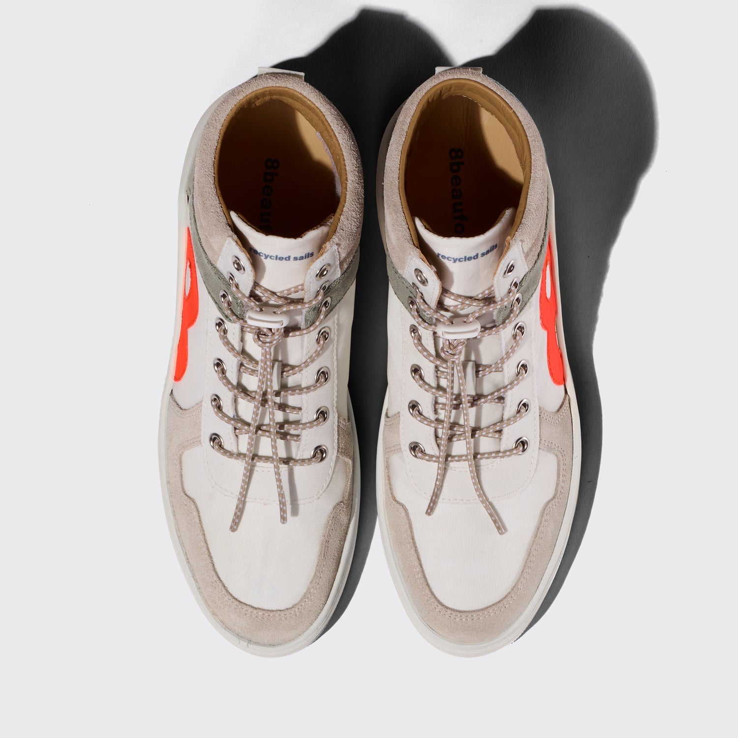 Mid High Sneaker von 8beaufort.Hamburg, gefertigt aus recyceltem Segeltuch, mit Innenfutter aus vegetabil und chromfrei gegerbtem Leder und Baumwolle. Sohle aus Naturkautschuk und flexible Schnürsenkel. Das Leder, welches wir als Innenfutter verwenden kommt aus zertifizierten Gerbereien aus Portugal.