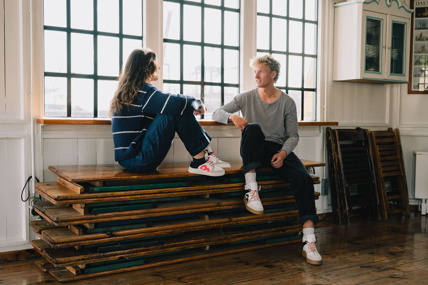 Weißer Mid High Sneaker für Herren von 8beaufort.Hamburg, gefertigt aus recyceltem Segeltuch, mit Innenfutter aus vegetabil und chromfrei gegerbtem Leder und Baumwolle. Sohle aus Naturkautschuk und flexible Schnürsenkel. Das Leder, welches wir als Innenfutter verwenden kommt aus zertifizierten Gerbereien aus Portugal.